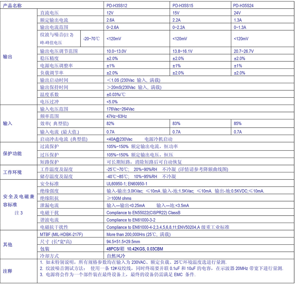 待机功耗<0.5W高电压交流输入范围小体积,高功率密度,长寿命,高可靠性短时承受300VAC 5 sec.输出保护功能: 过流保护/过压保护/短路保护超宽工作温度环境 (-20℃~70℃),100%满载 @50℃、60%满载@70℃电解电容全部使用105℃下长寿命进口电解电容100% 满载老化测试PCB 焊锡面刷三防漆适合较严酷环境使用
